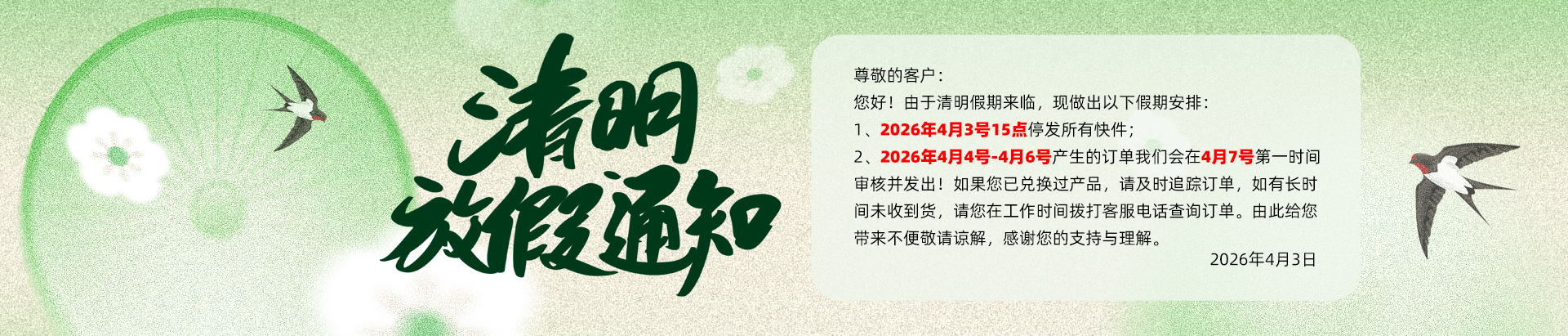 尊敬的客户: 您好!由于清明假期来临,现做出以下假期安排: 1、2026年4月3号15点停发所有快件; 2、2026年4月4号-4月6号产生的订单我们会在4月7号第一时间审核并发出! 如果您已兑换过产品,请及时追踪订单,如有长时间未收到货, 请您在工作时间拨打客服电话查询订单。 由此给您带来不便,敬请谅解,感谢您的支持与理解。 配送部2026年4月3日